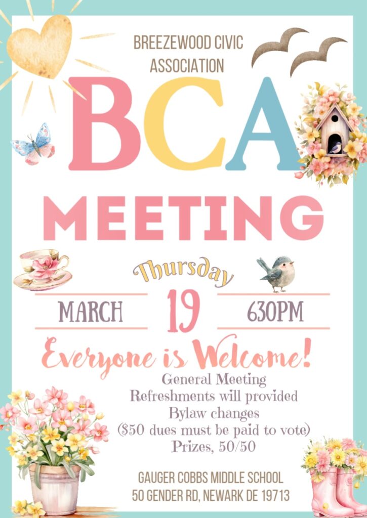 President Robert McFarland, any questions let me know or you want to help with civic association etc. Contact me at 302 287 3354 or mcfar2222@yahoo.com